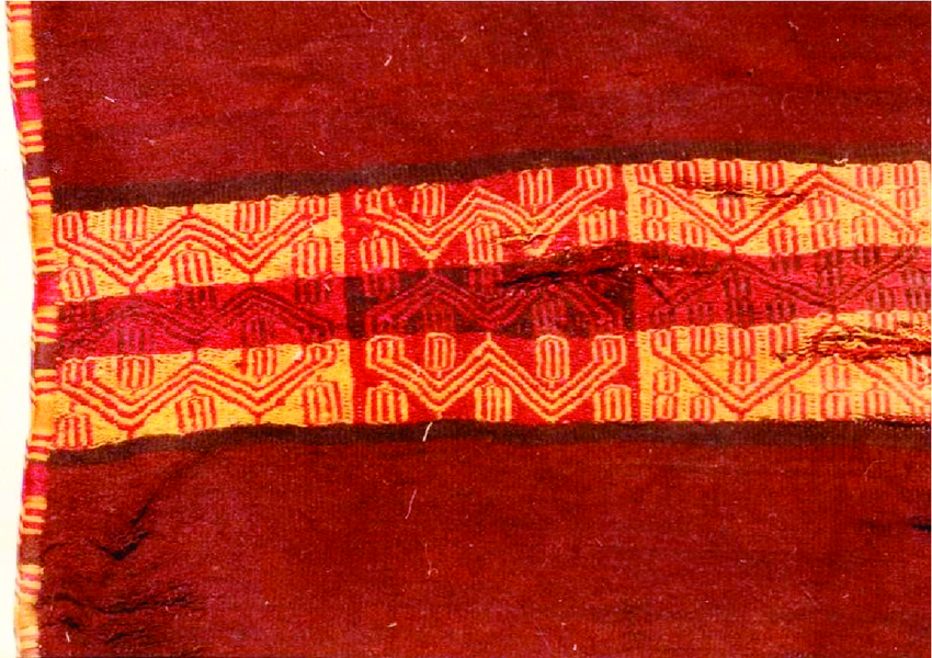 Dans les Andes précolombiennes, les enfants sacrifiés comme messagers pour les dieux étaient accompagnés de nombreux textiles en offrandes de la meilleure qualité possible, il s’agissait d’offrandes pour les dieux. Il y avait des tisserandes d’élites (généralement enterrées près des temples) qui étaient spécialisées dès leur enfance pour la fabrication de textiles de première qualité. On pourrait être surpris que la couleur des aplats unis n’est pas aussi régulière… Ce n’est pas dû à un problème de teinture, celle-ci est très saturée et a très bien résisté au temps.